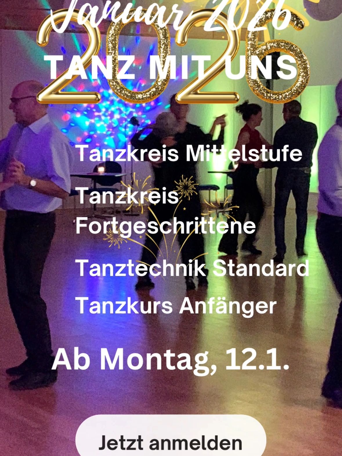 Wir bieten Tanzen auf unterschiedlichem Niveau für alle Altersklassen, Kinder, Jugendliche, Erwachsene, Senioren, Einzeltänzer oder Paare und viele Tanzarten und Tänze: 5 Standard- und 5 Lateinamerikanische Tänze, Discofox, Bachata, Salsa, New Vogue und vieles mehr. Auch für Einzelpersonen möglich.