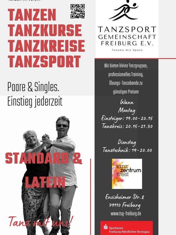 Die Tanzsportgemeinschaft Freiburg e.V. ein gemeinnütziger TanzSport-Verein mit dem Ziel, günstige Tanzangebote in verschiedenen Tanzarten für alle Altersbereiche anzubieten. Die TSG ist bekannt für ihre hochqualifizierten Trainer. Alle Kurse und Gruppen werden von ausgebildeten und erfahrenen Tanzsporttrainern , lizenzierten Übungsleitern oder Professionaltrainern geleitet. Eintritt ist jederzeit möglich.